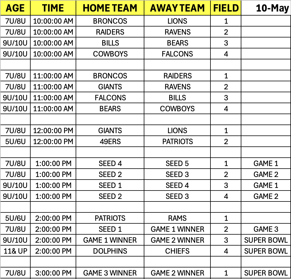 We are excited about our Spring 2025 NFL Flag Football season. See below for the full schedule. Please keep in mind that any cancelations due to weather or any unforeseen circumstances will affect the schedule.